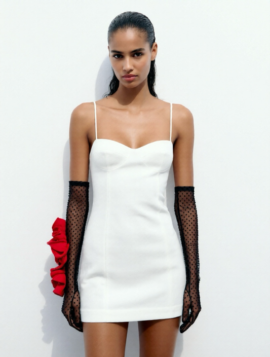 Long Black Polka Dot Gloves With Red Sequin Rose