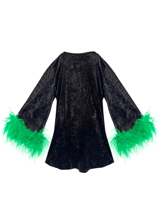 Jess Mini Little Black Velvet Dress With Green Feathers