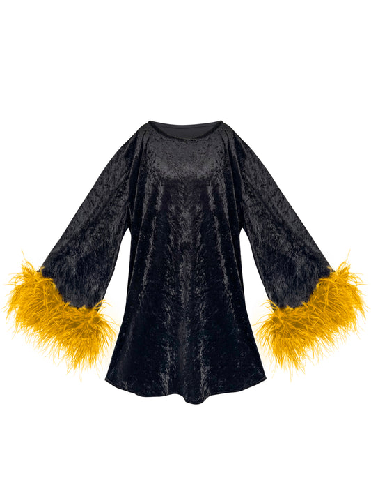 Jess Mini Little Black Velvet Dress With Yellow Feathers