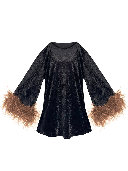 Jess Mini Little Black Velvet Dress With Brown Feathers