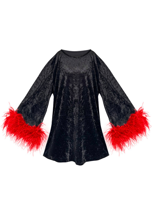 Jess Mini Little Black Velvet Dress With Red Feathers