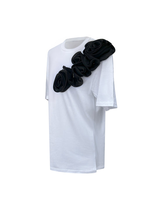 Black Cotton T-Shirt With White Sided Rose