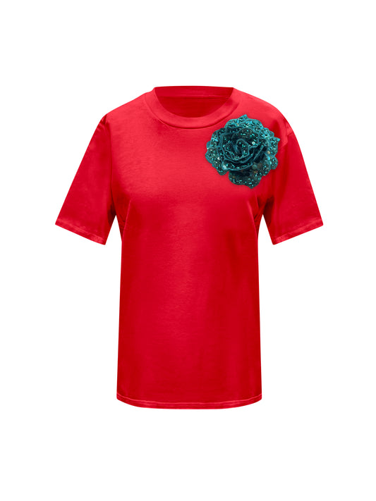 Red Cotton T-Shirt With Sequin Flower
