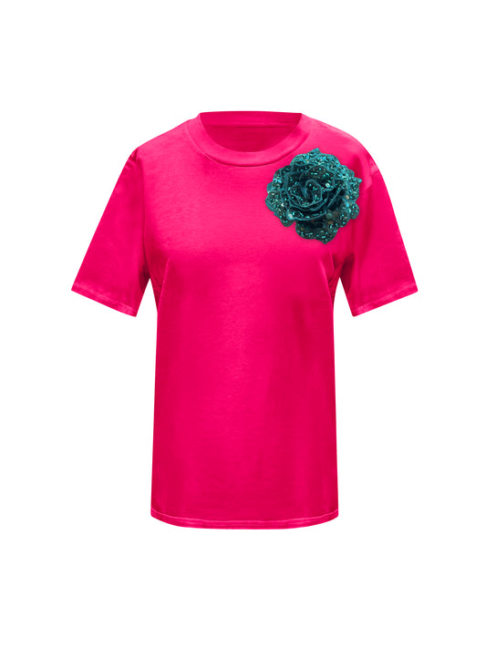 Pink Cotton T-Shirt With Sequin Flower