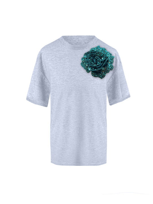 Grey Cotton T-Shirt With Sequin Flower