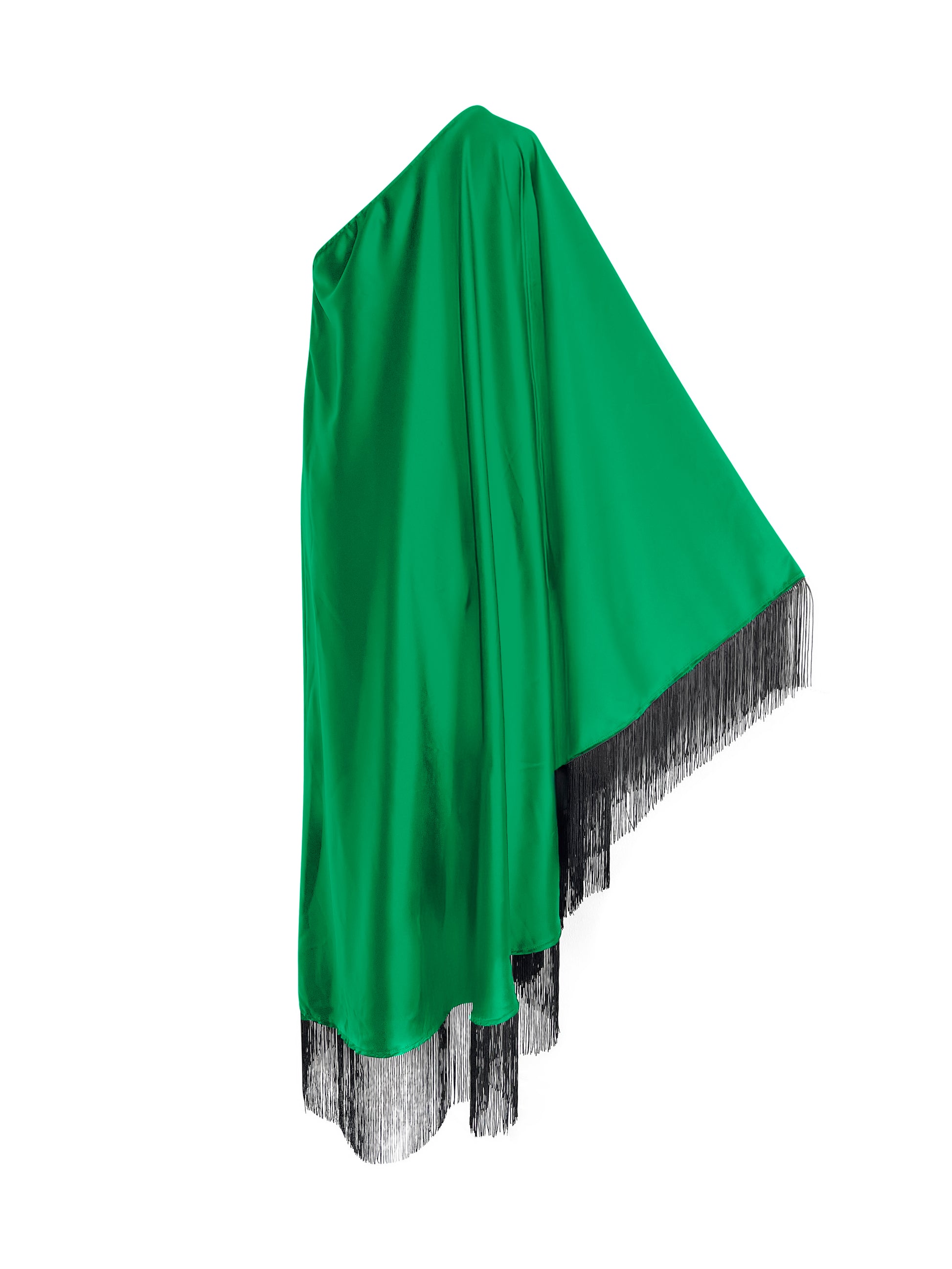 The Black Fringe Off Shoulder Green Glam Midi dress by Toma is comfortable, yet stylish. This dress features a one-shoulder neckline that is stretchy and can also be adapted to your body. Featured in green, this long length dress has black fringe trim detailing that is sophisticated and elegant. Stretchy and asymmetric neckline to adjust to your body. Made from cotton. Cut to be worn very loose.