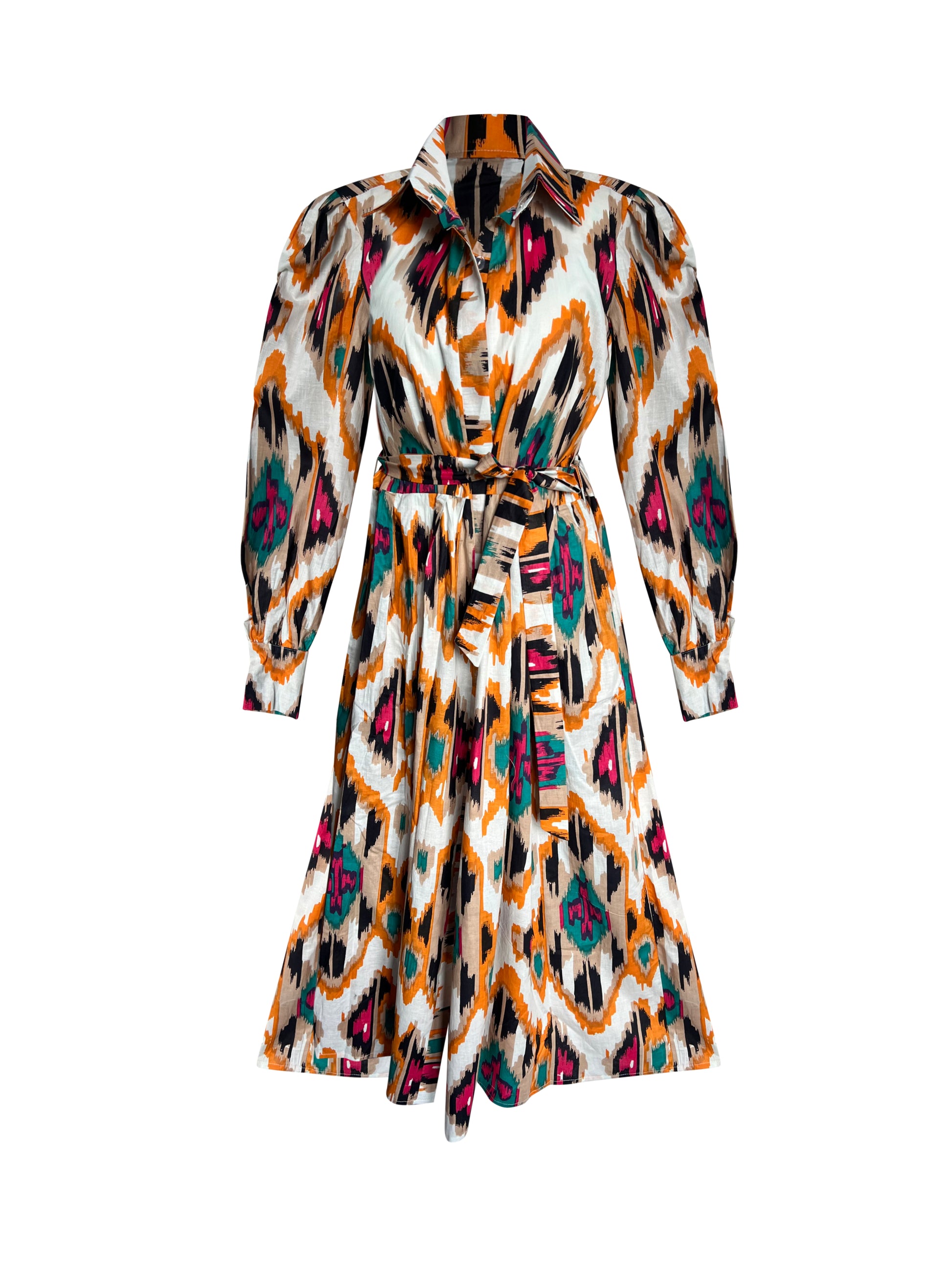 The Carmelita Dress by Toma features a high-neck, tie-waist, concealed button placket and a bold print pattern that is bound to turn heads.