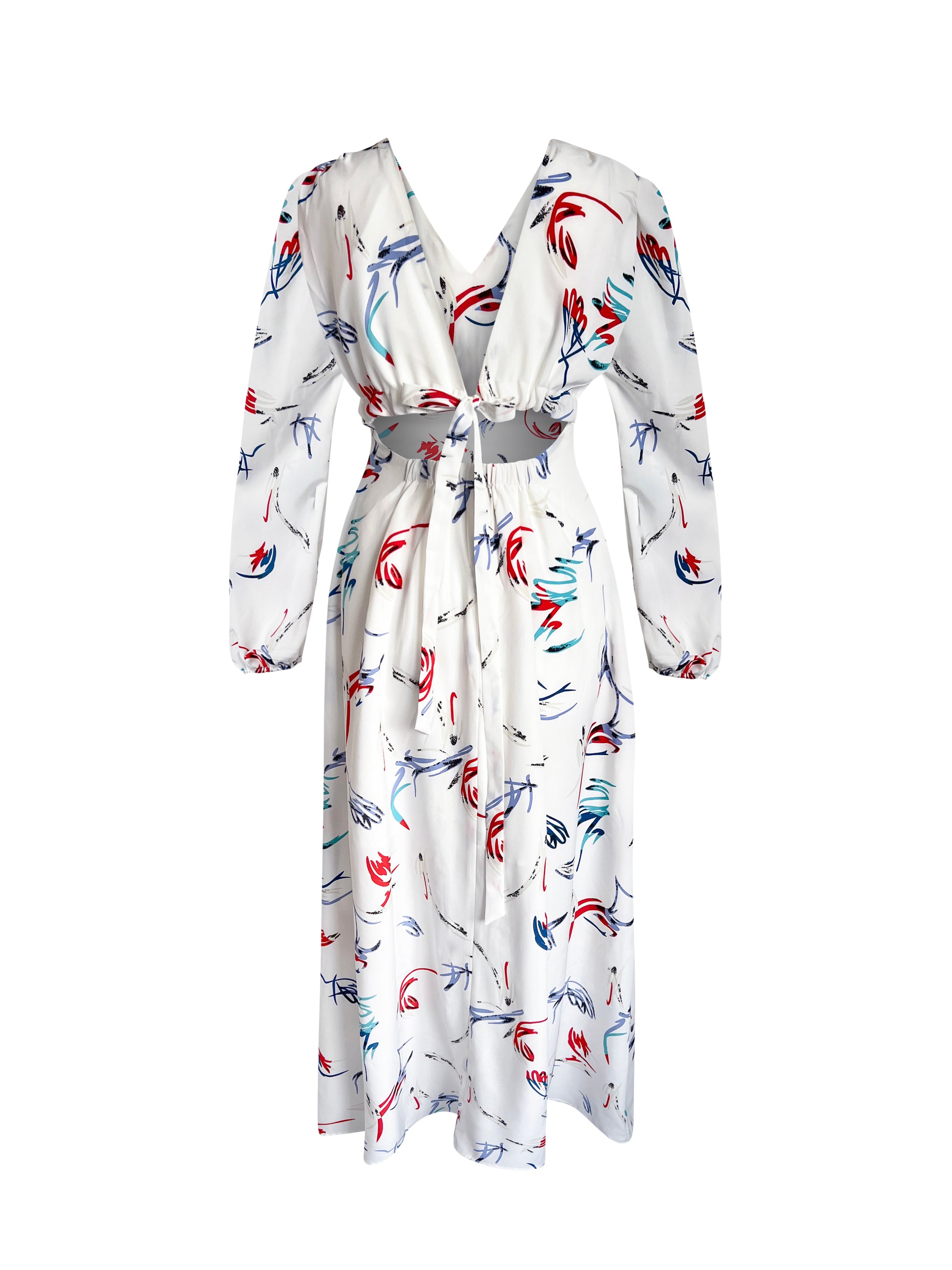 The Chic Dress is a maxi-length dress designed and made by Toma. With a v-neck style and backless design, this dress is perfect for everyday wearing. Pair with black boots to create a full-look.