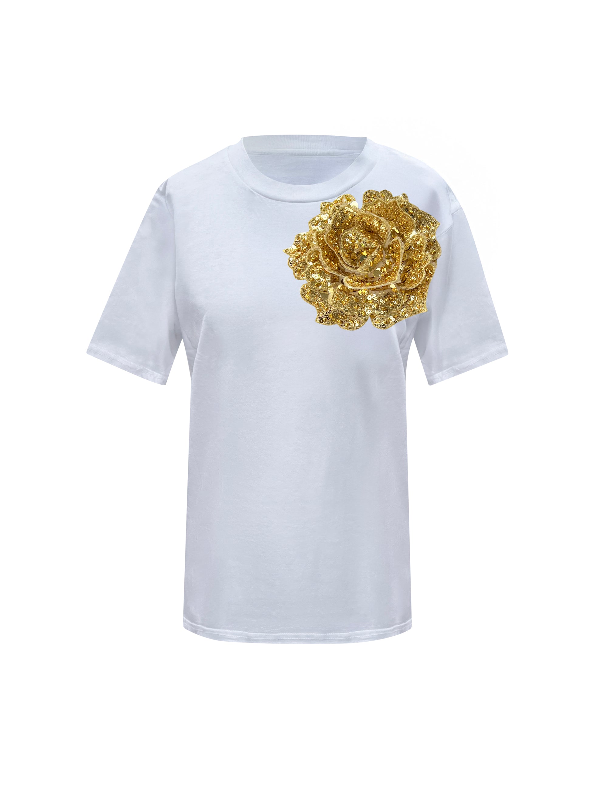 The cotton T-shirt is iconic to the 90's style. With a gold side sequin rose and perfect to pair with your favourite jeans or leggings to create casual look.