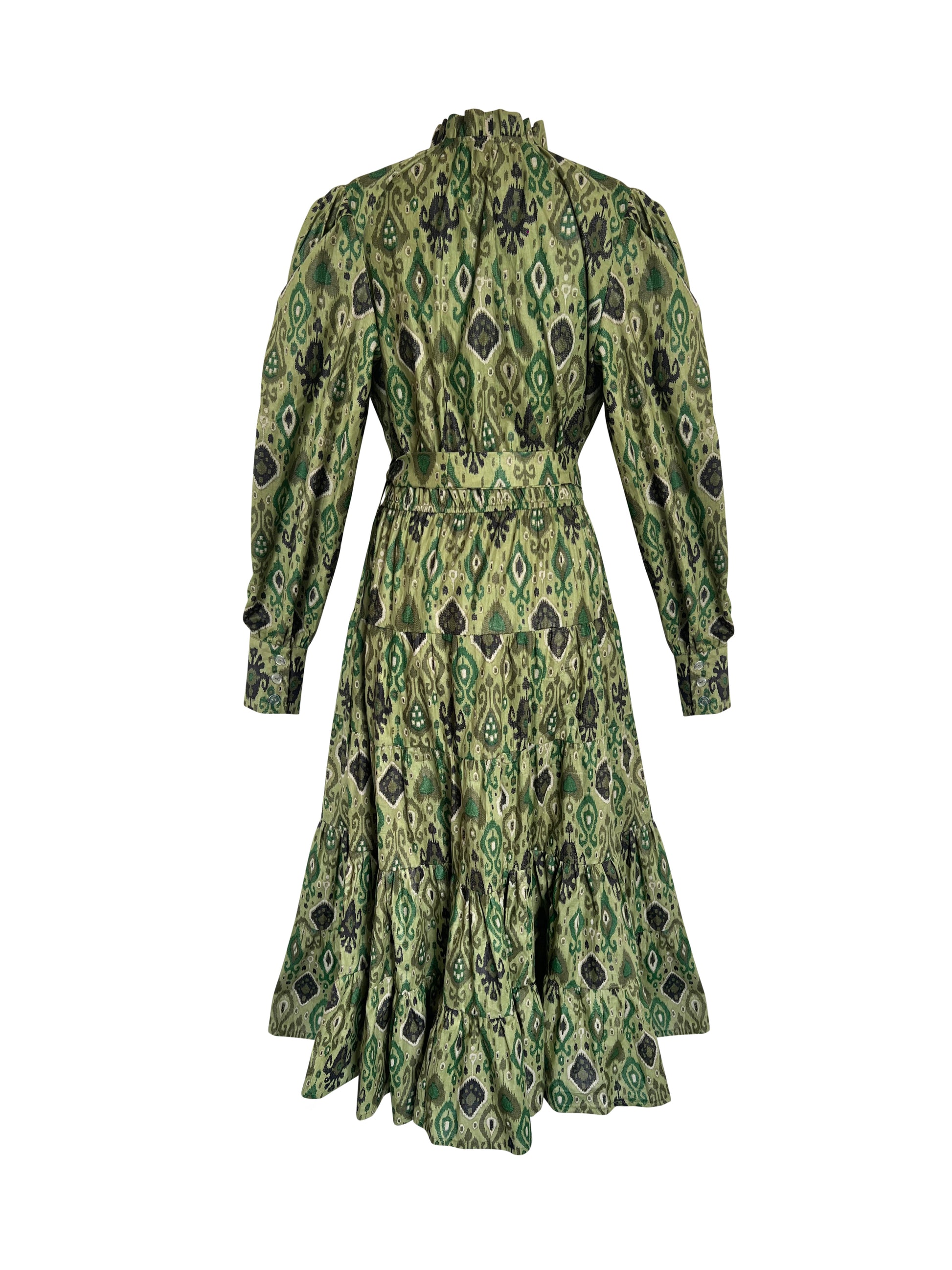 The Grass Green Dress by Toma features a V-neck, tie-waist, concealed button placket and a bold print pattern that is bound to turn heads.
