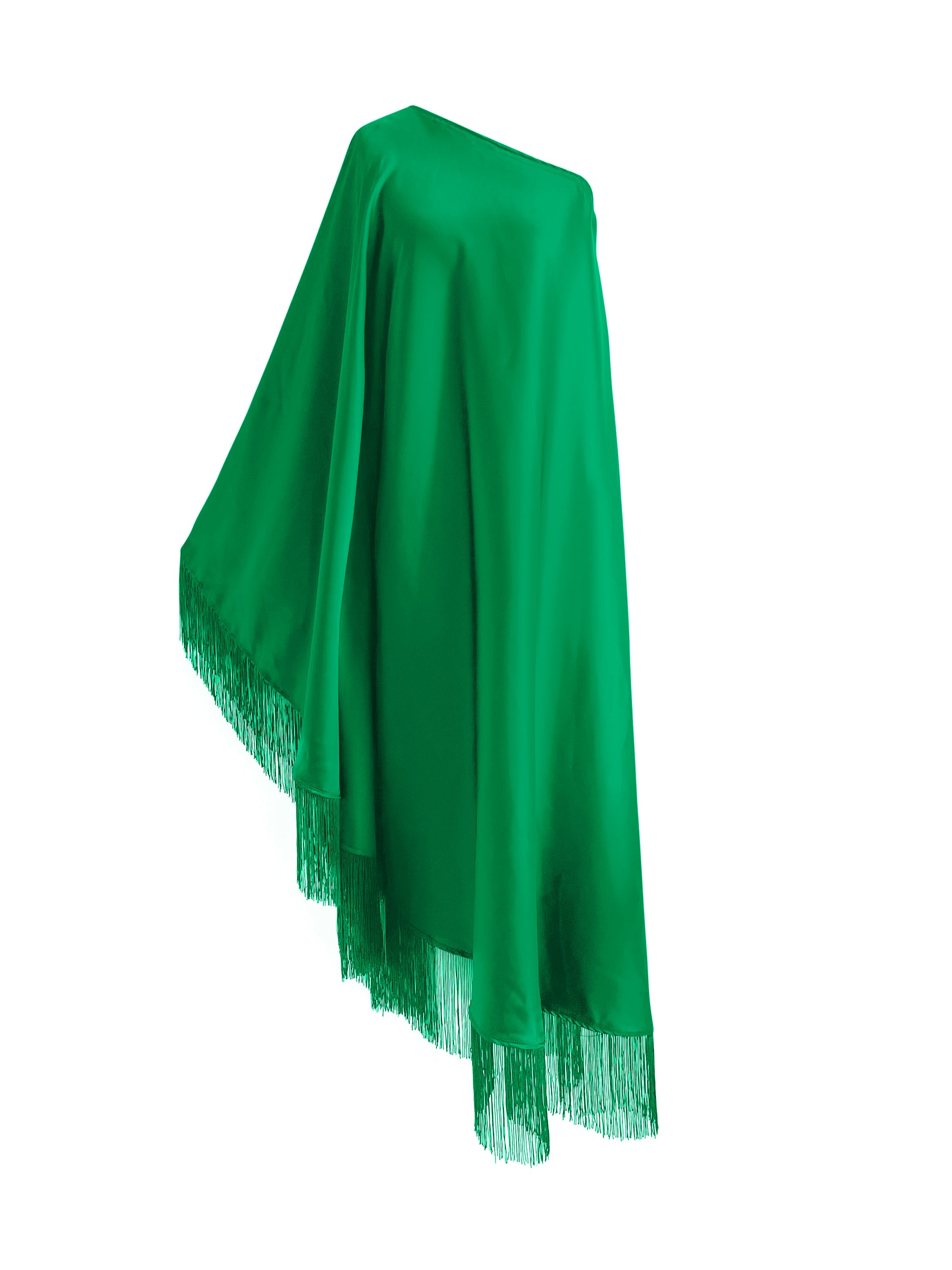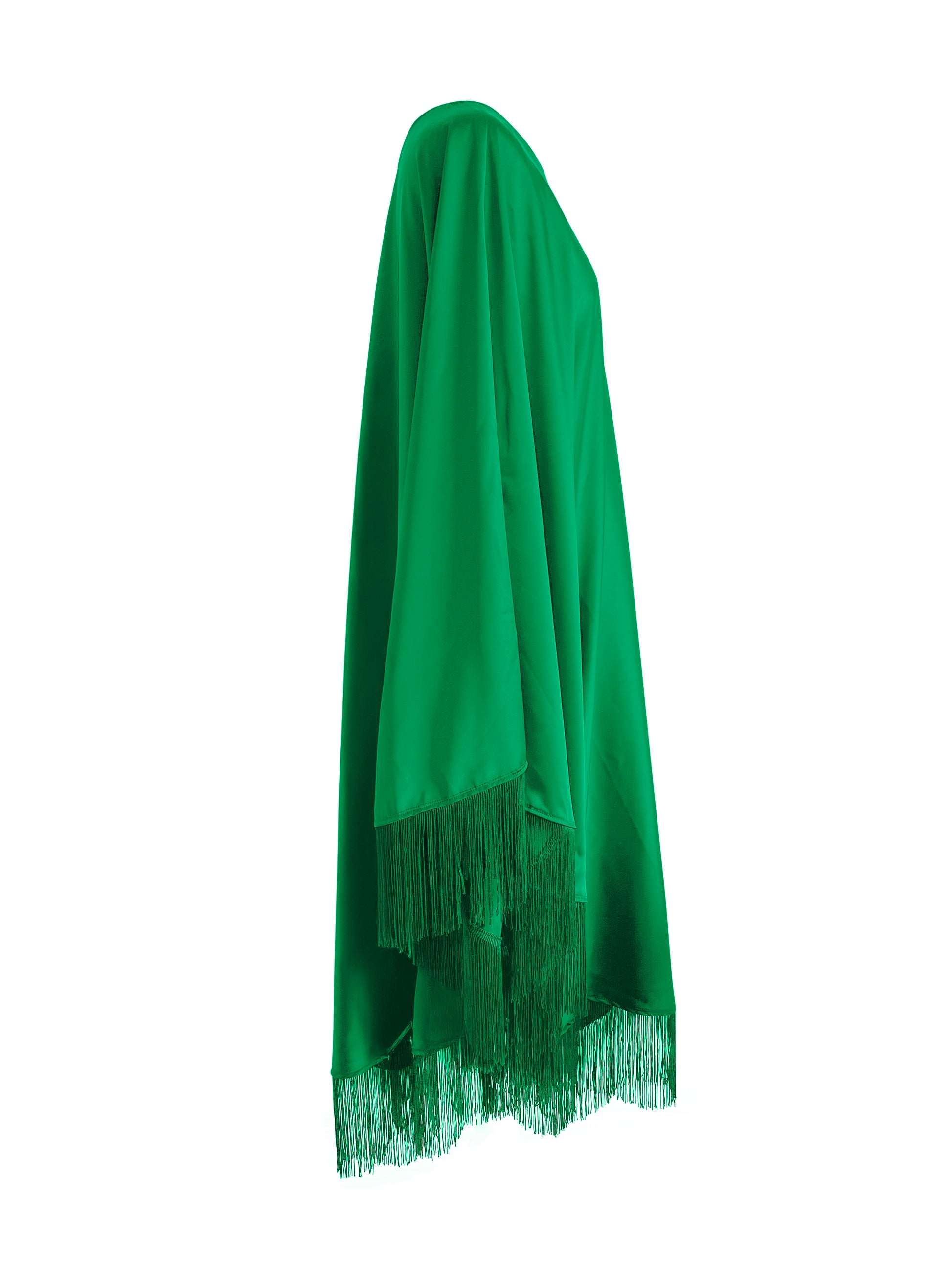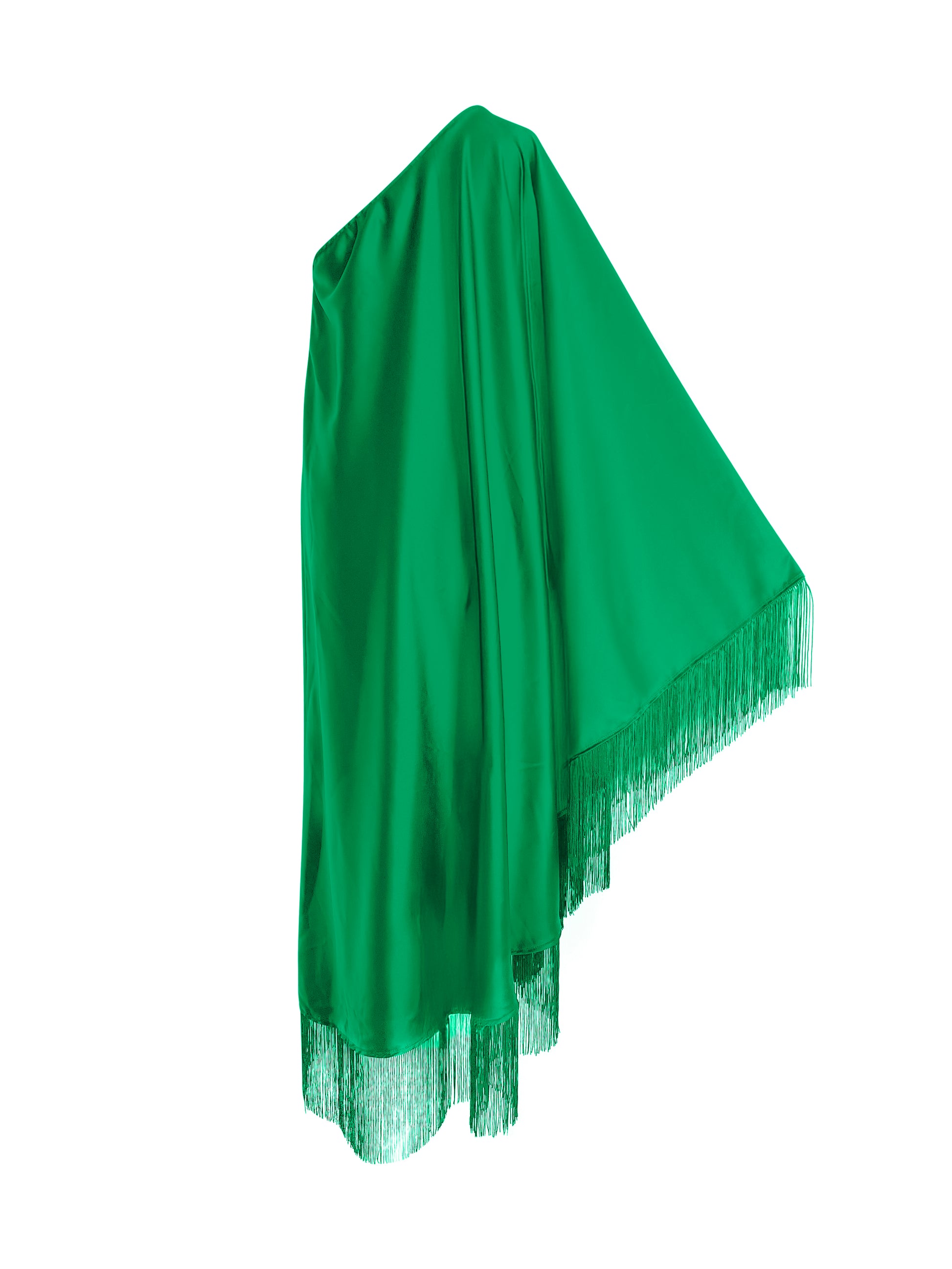 The Green Fringe Off Shoulder Glam Midi dress by Toma is comfortable, yet stylish. This dress features a one-shoulder neckline that is stretchy and can also be adapted to your body. Featured in green, this long length dress has green fringe trim detailing that is sophisticated and elegant. Stretchy and asymmetric neckline to adjust to your body. Made from cotton. Cut to be worn very loose.