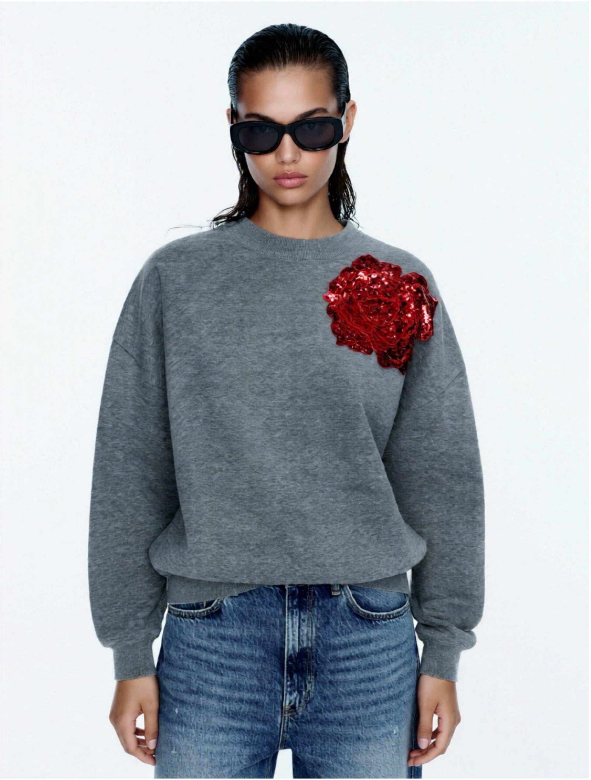 Grey Cotton Sweatshirt With Red Sequin Flower