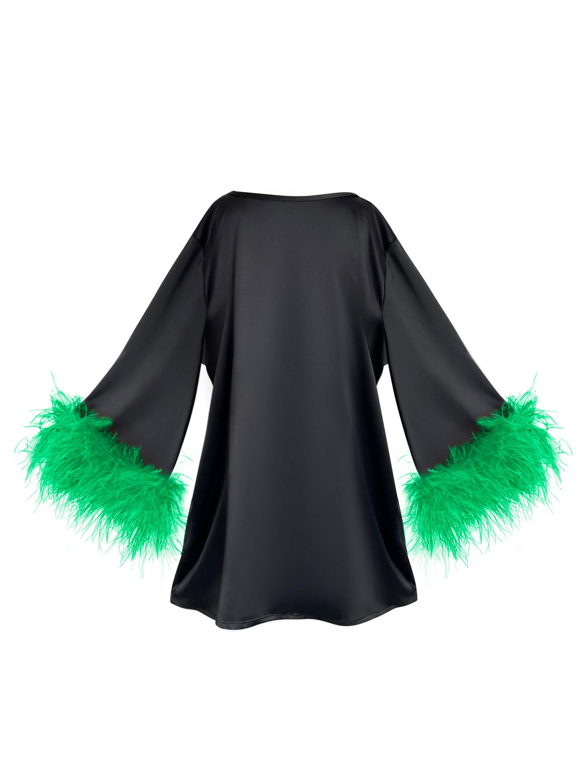 The Jess Mini Little Black Silk Satin Dress has a round neckline and flared sleeves. A-line mini dress in soft satin with long angle sleeves and lavish feather trims.
