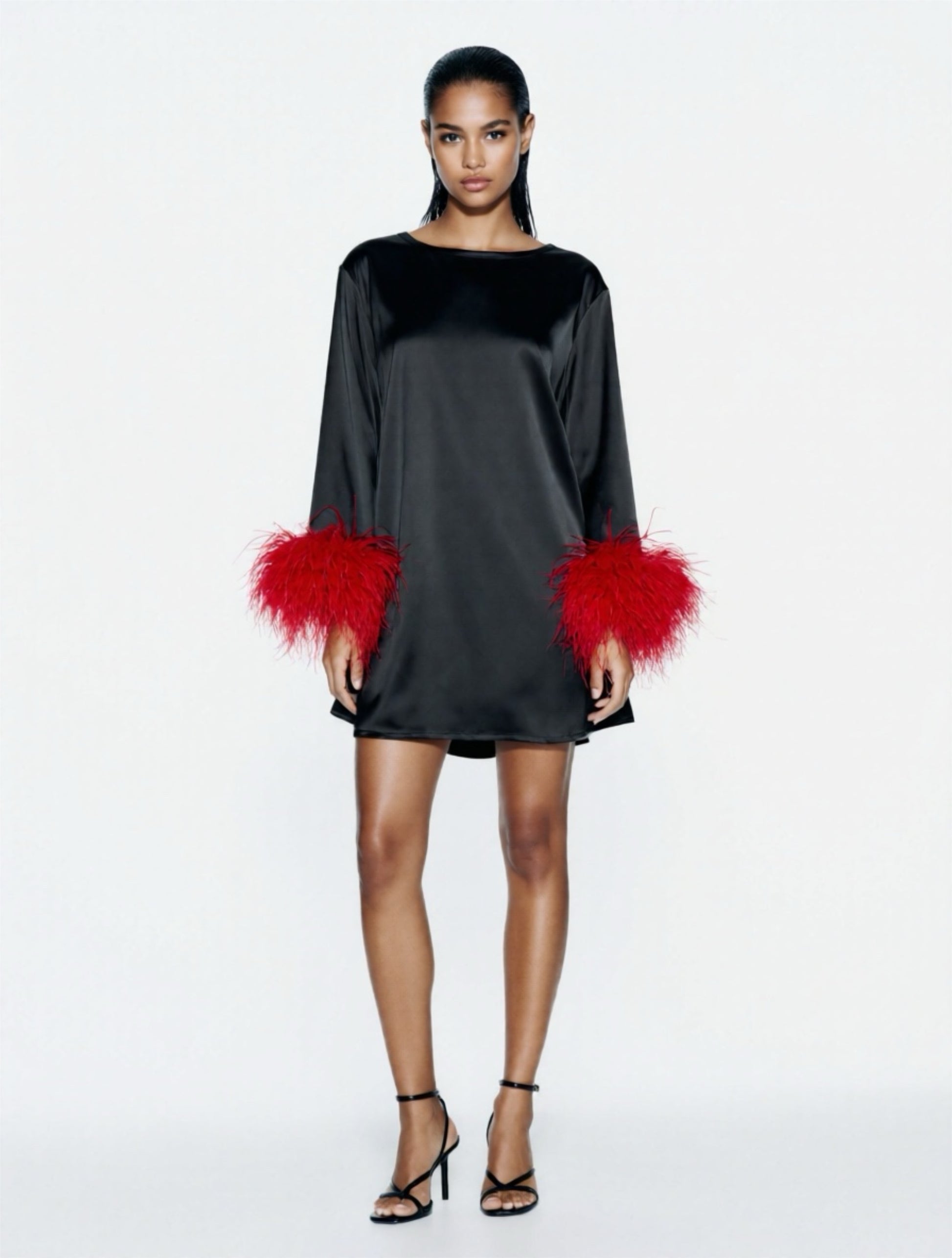 The Jess Mini Little Black Silk Satin Dress has a round neckline and flared sleeves. A-line mini dress in soft satin with long angle sleeves and lavish feather trims.