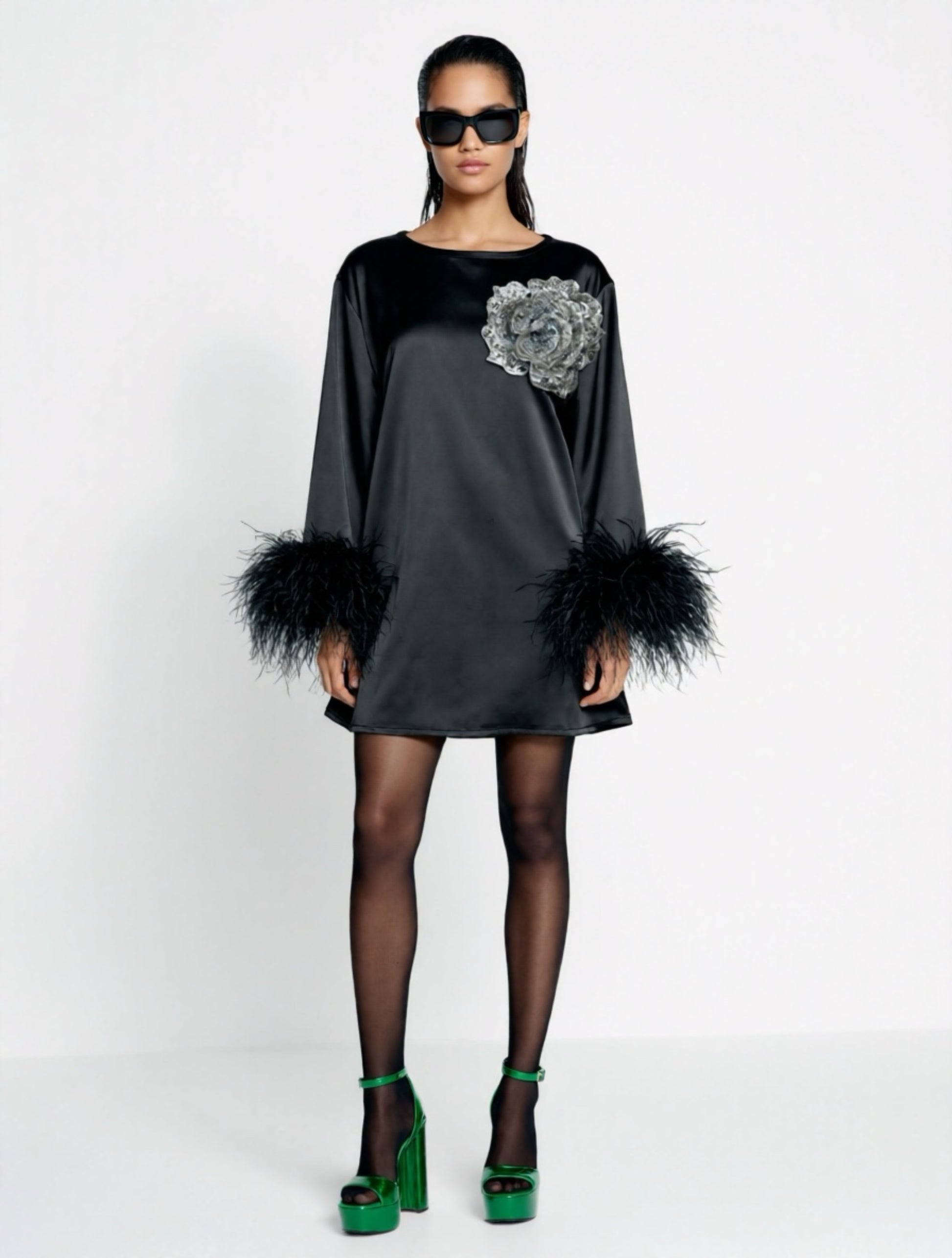 The Jess Mini Little Black Silk Satin Dress with silver sequin flower has a round neckline and flared sleeves. A-line mini dress in soft satin with long angle sleeves and lavish feather trims.