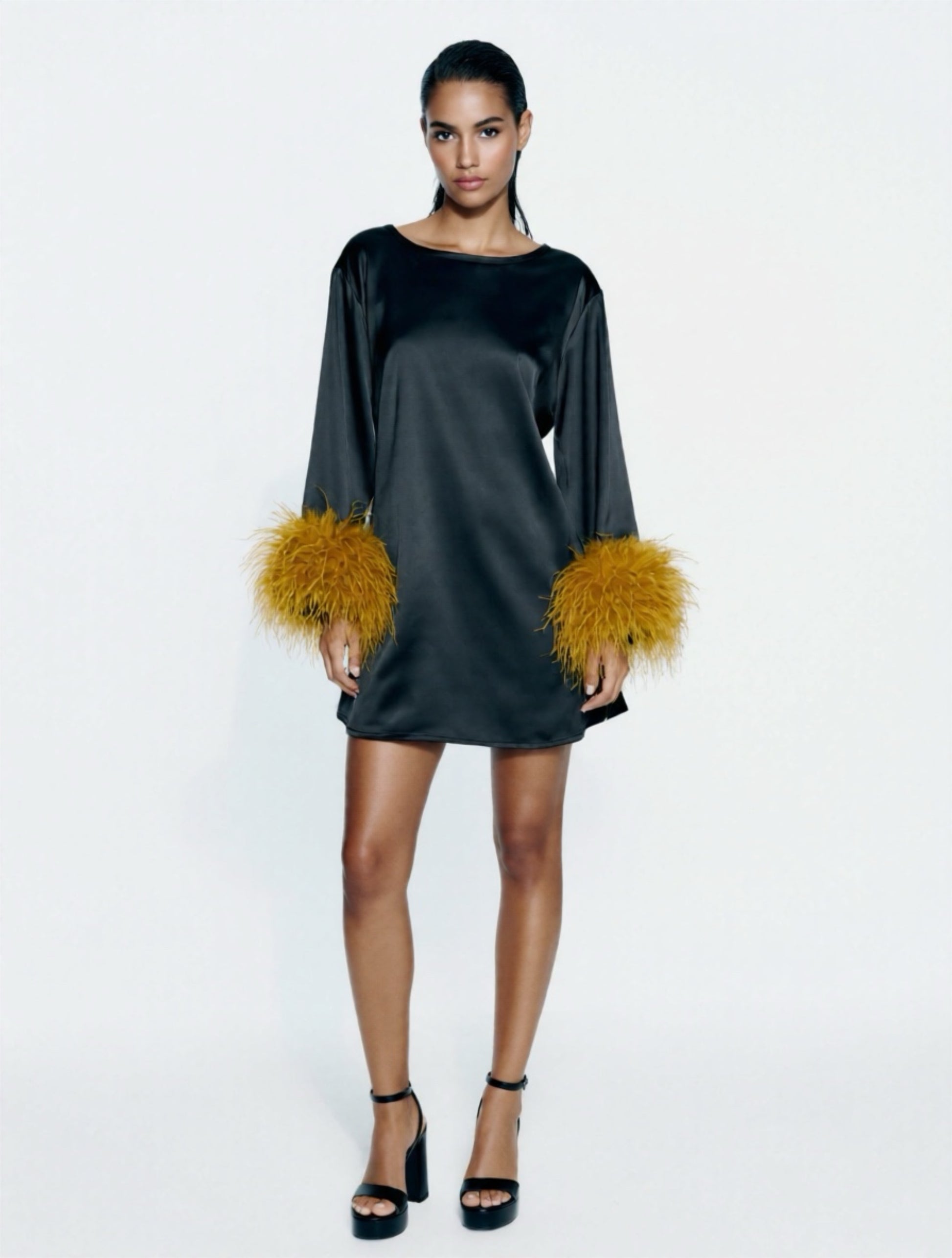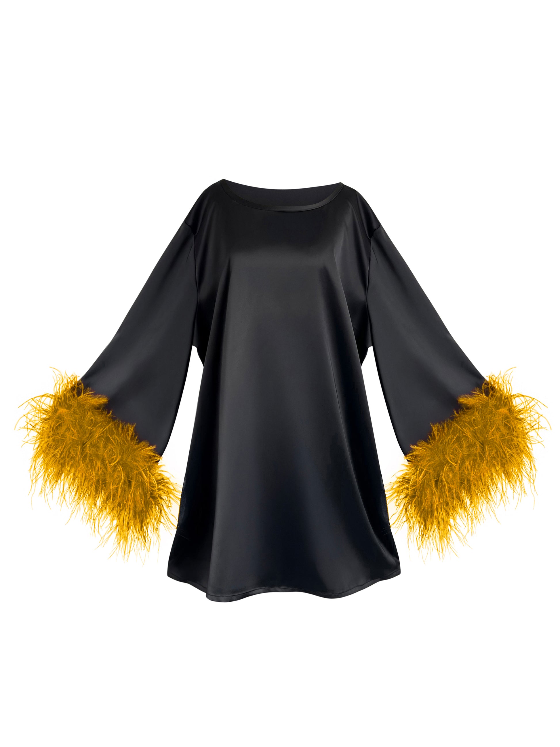 The Jess Mini Little Black Silk Satin Dress has a round neckline and flared sleeves. A-line mini dress in soft satin with long angle sleeves and lavish feather trims.