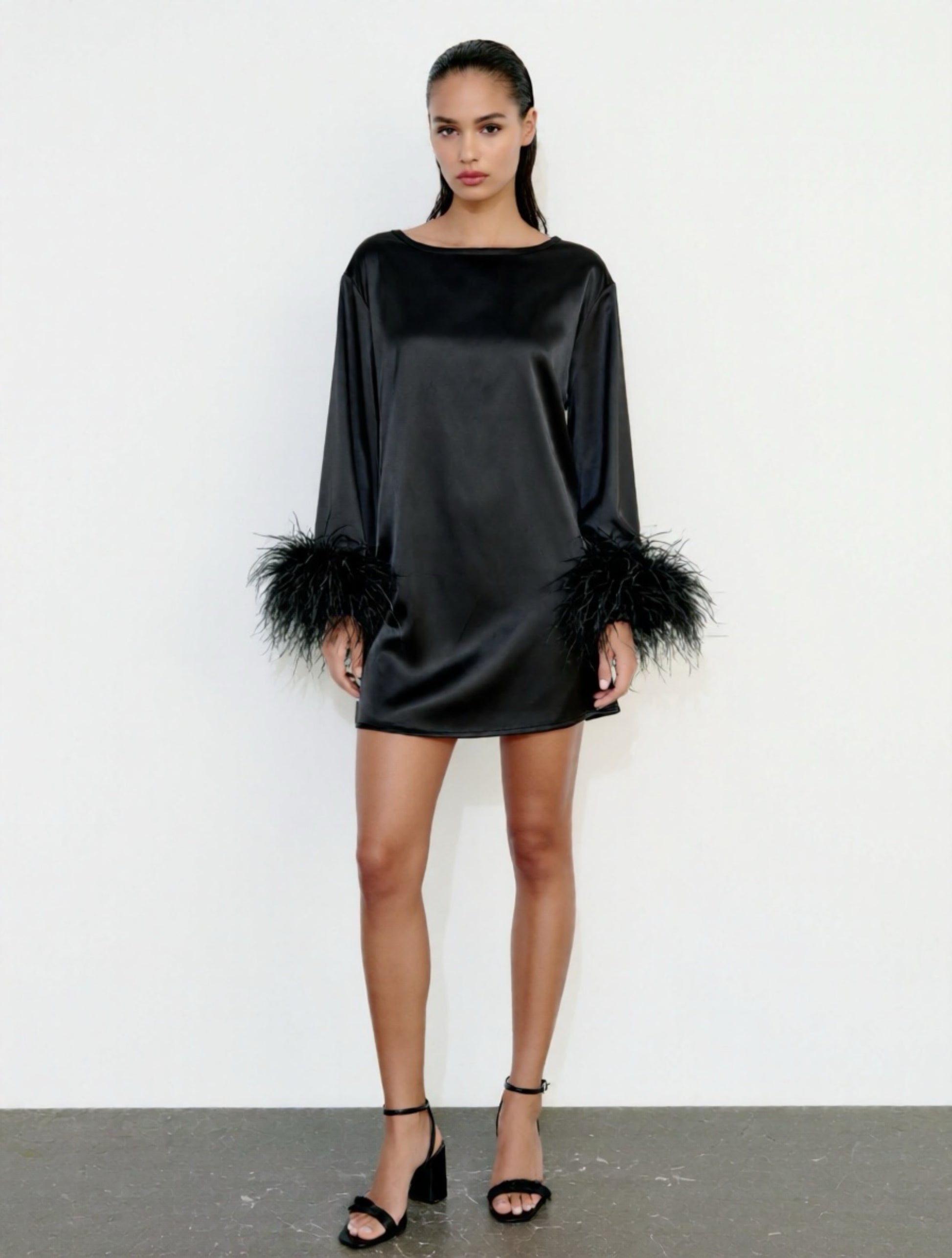 The Jess Mini Little Black Silk Satin Dress has a round neckline and flared sleeves. A-line mini dress in soft satin with long angle sleeves and lavish feather trims.