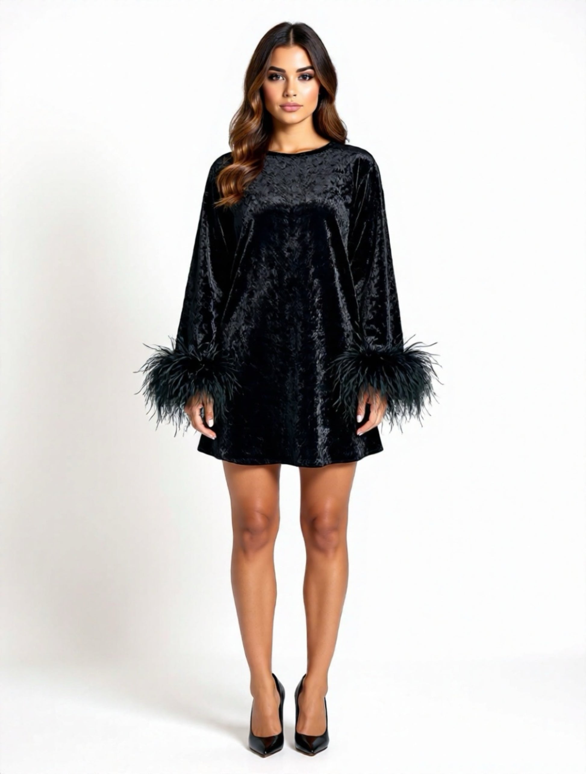 The Jess Mini Little Black Velvet Dress has a round neckline and flared sleeves. A-line mini dress in soft velvet with long angle sleeves and lavish feather trims.