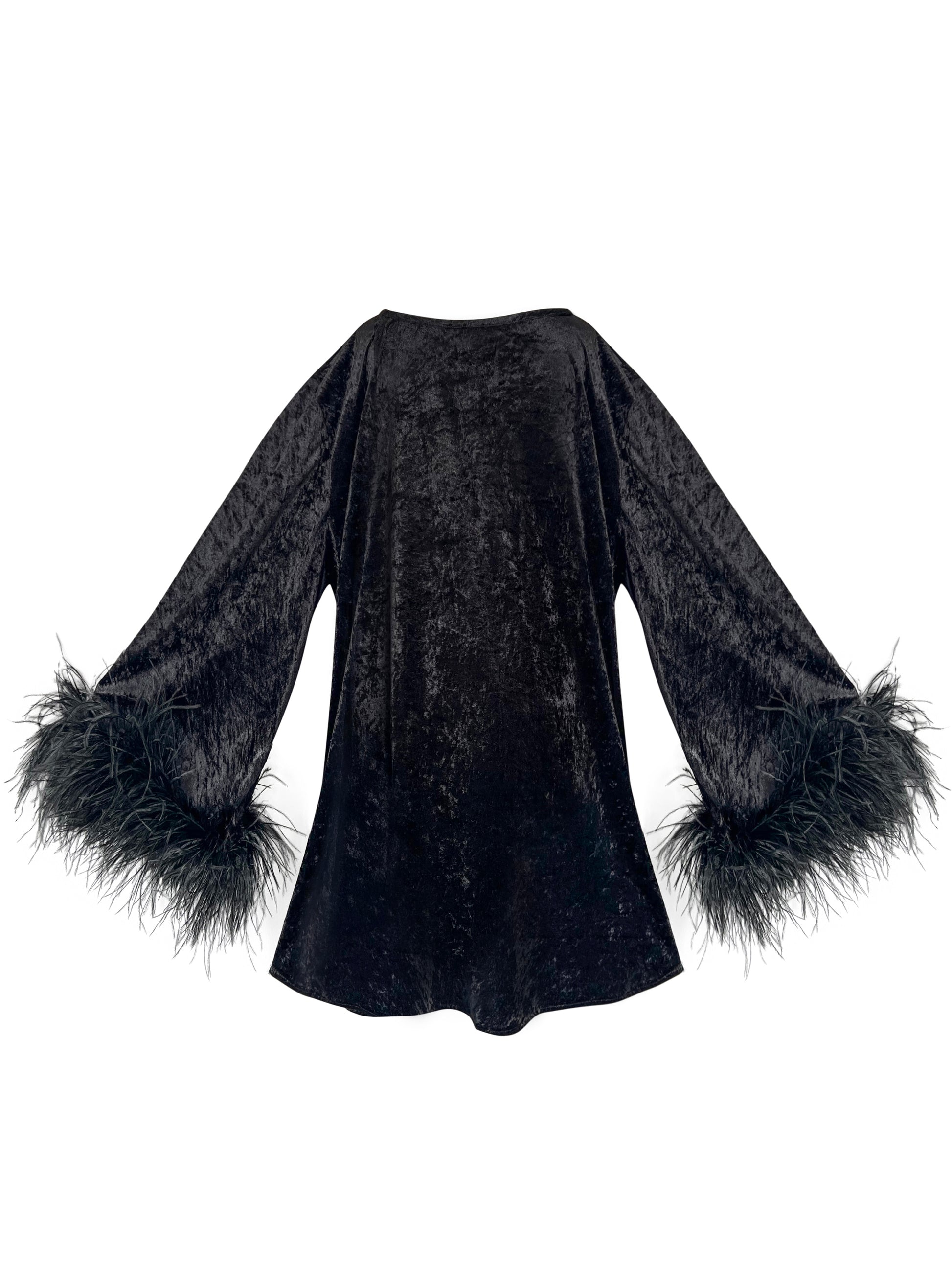 The Jess Mini Little Black Velvet Dress with fuchsia sequin flower has a round neckline and flared sleeves. A-line mini dress in soft velvet with long angle sleeves and lavish feather trims.