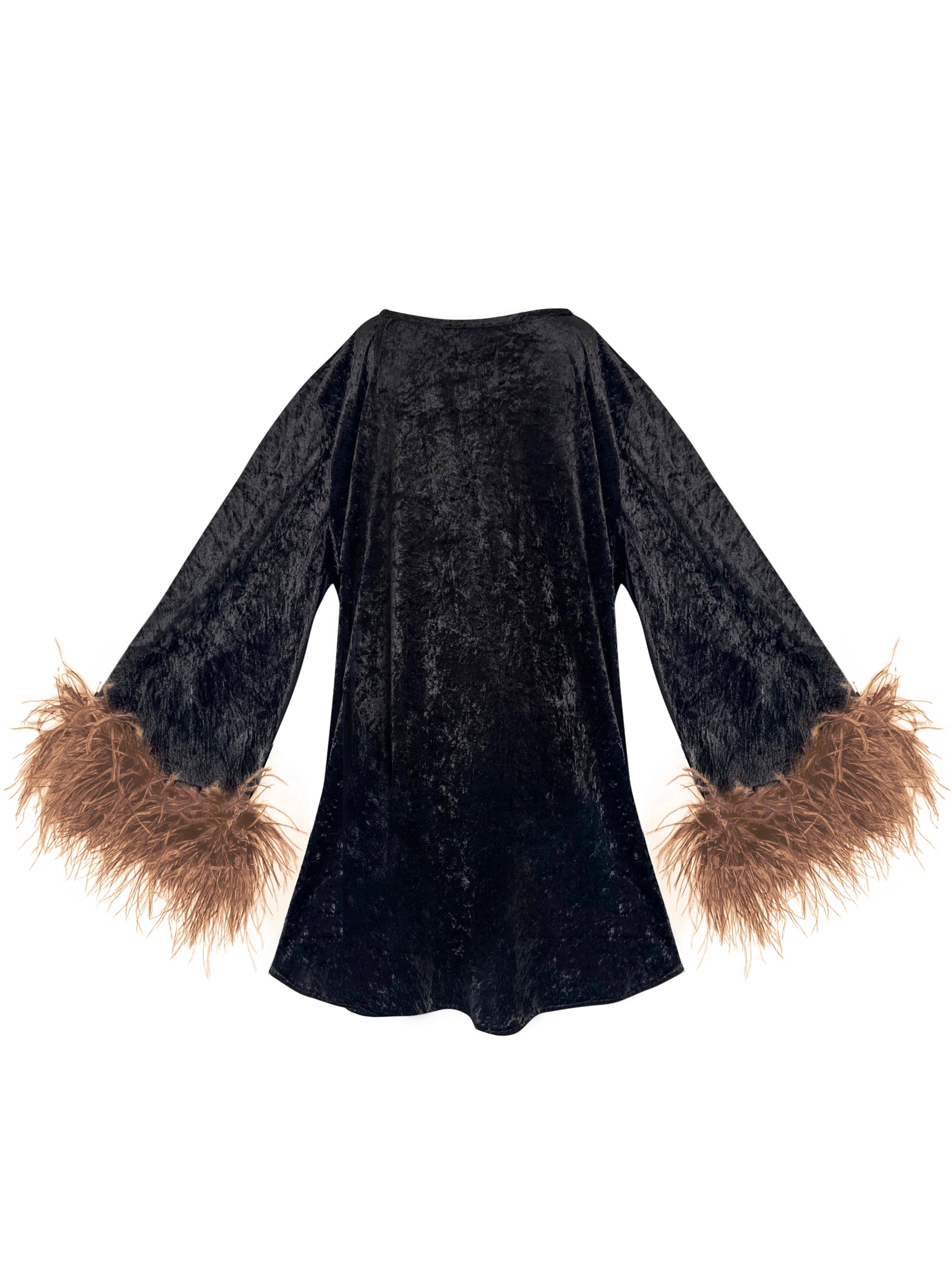 Jess Mini Little Black Velvet Dress With Brown Feathers