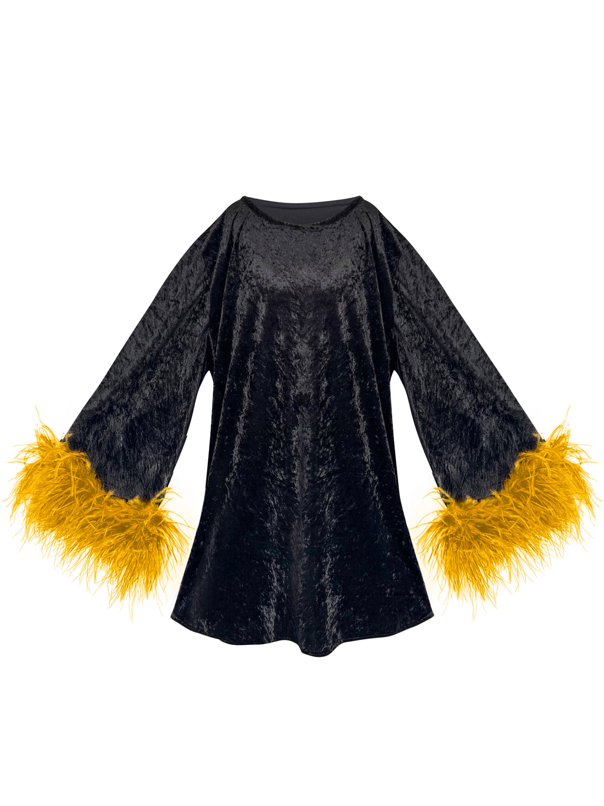 Jess Mini Little Black Velvet Dress With Yellow Feathers