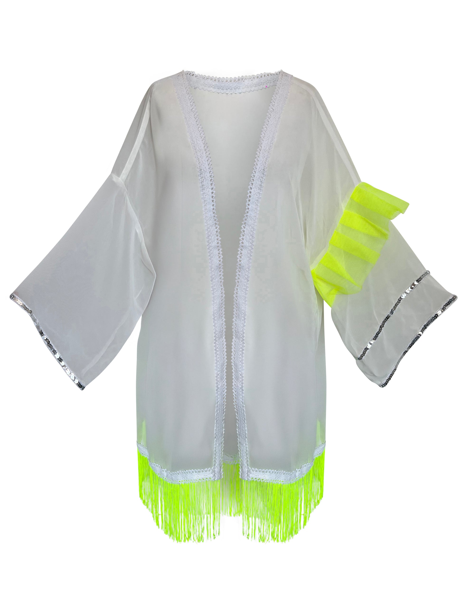 The Party Beach Vacation Glastonbury Holiday Tunic Cover Up is perfect for your next holiday. With a delicate feminine detailing, this kimono features wide sleeves and a waist tie.
