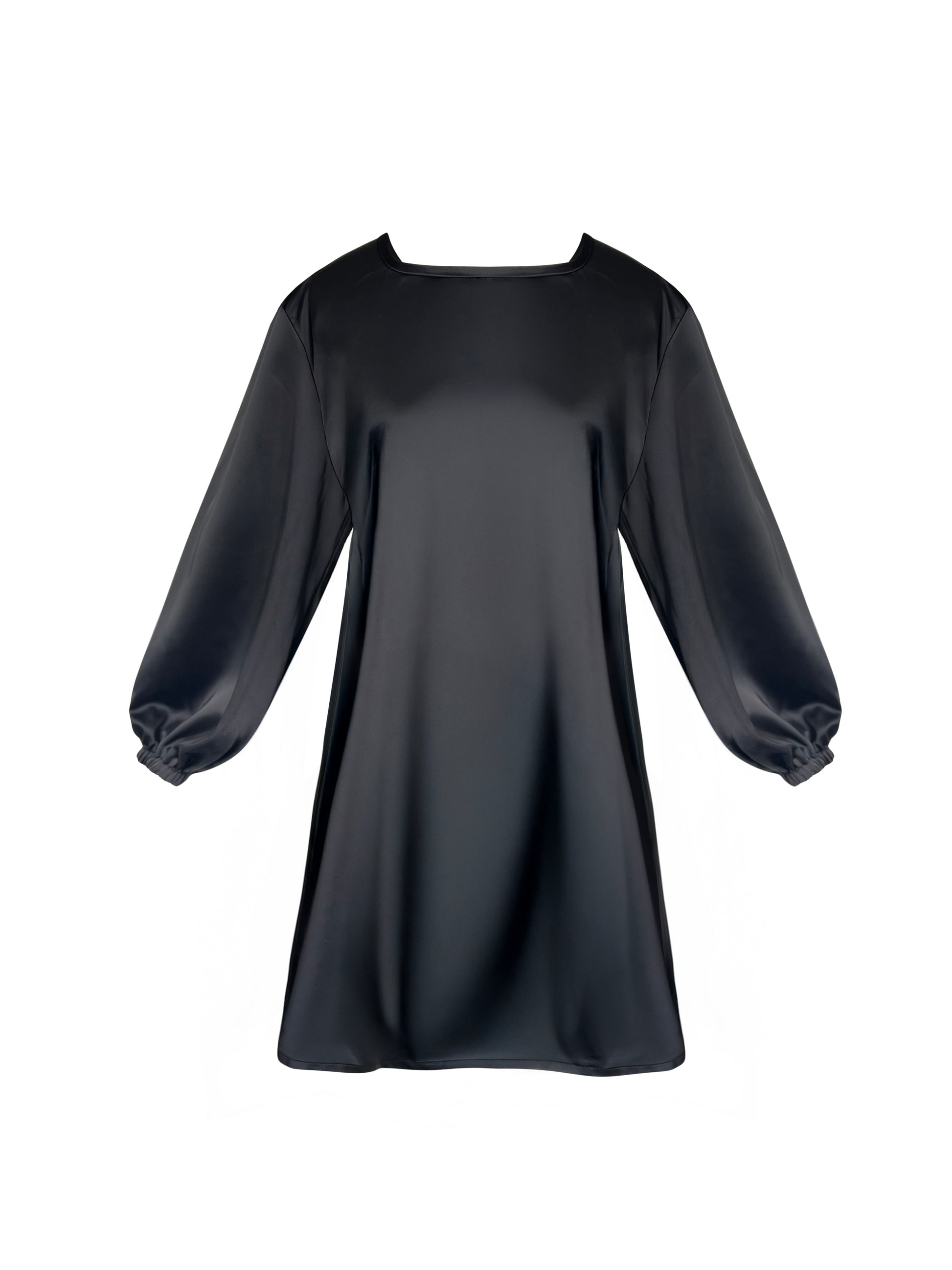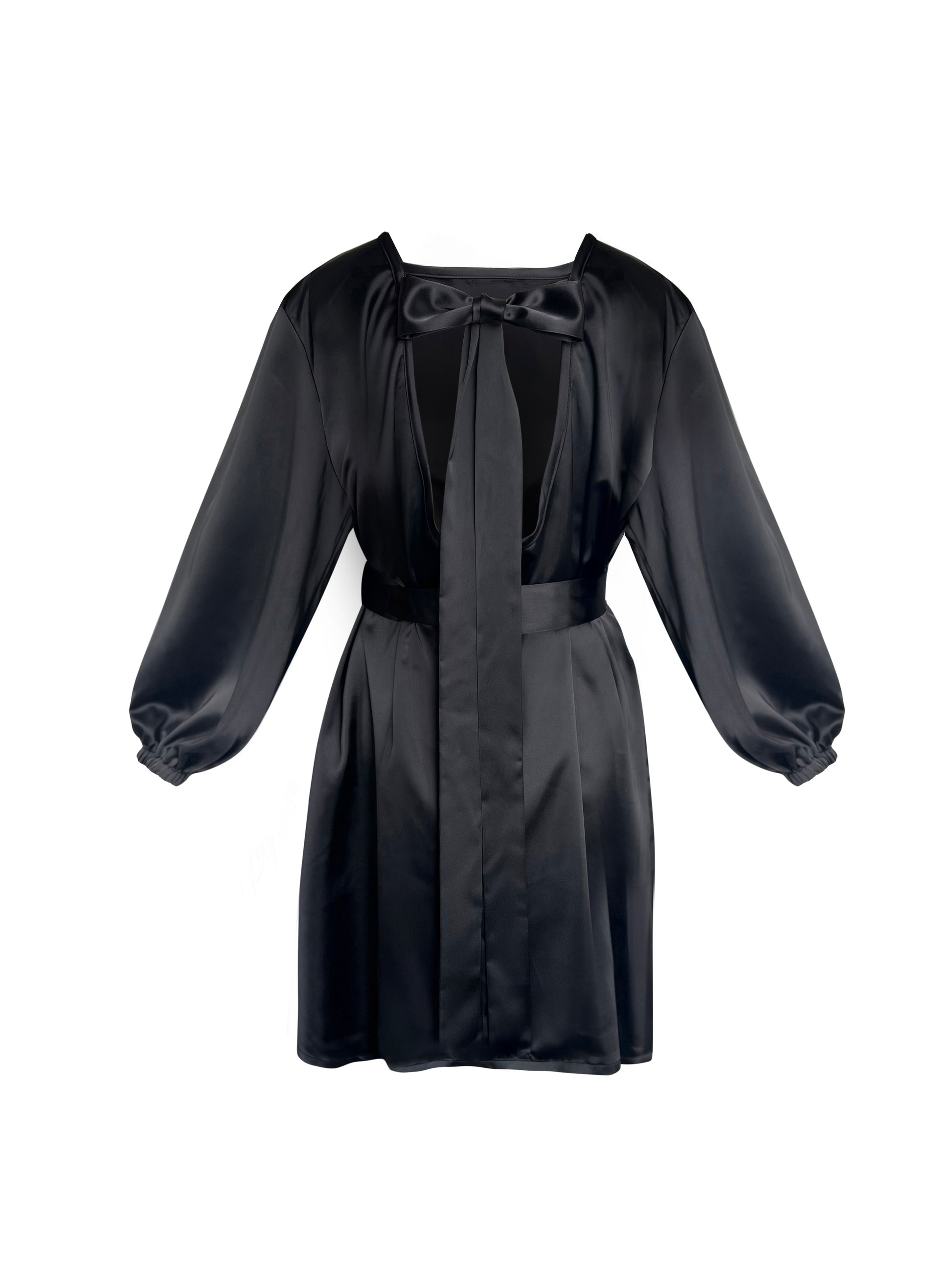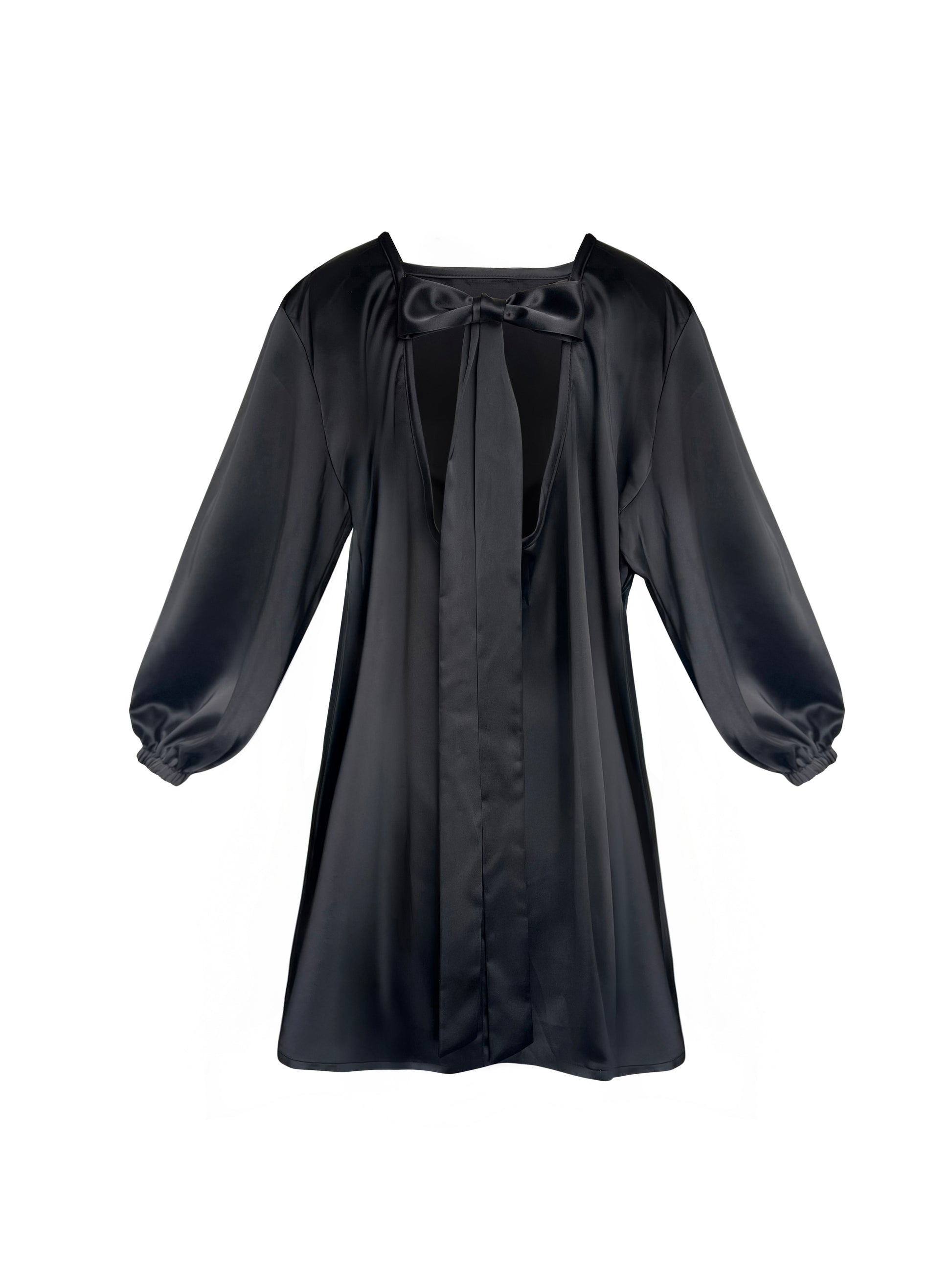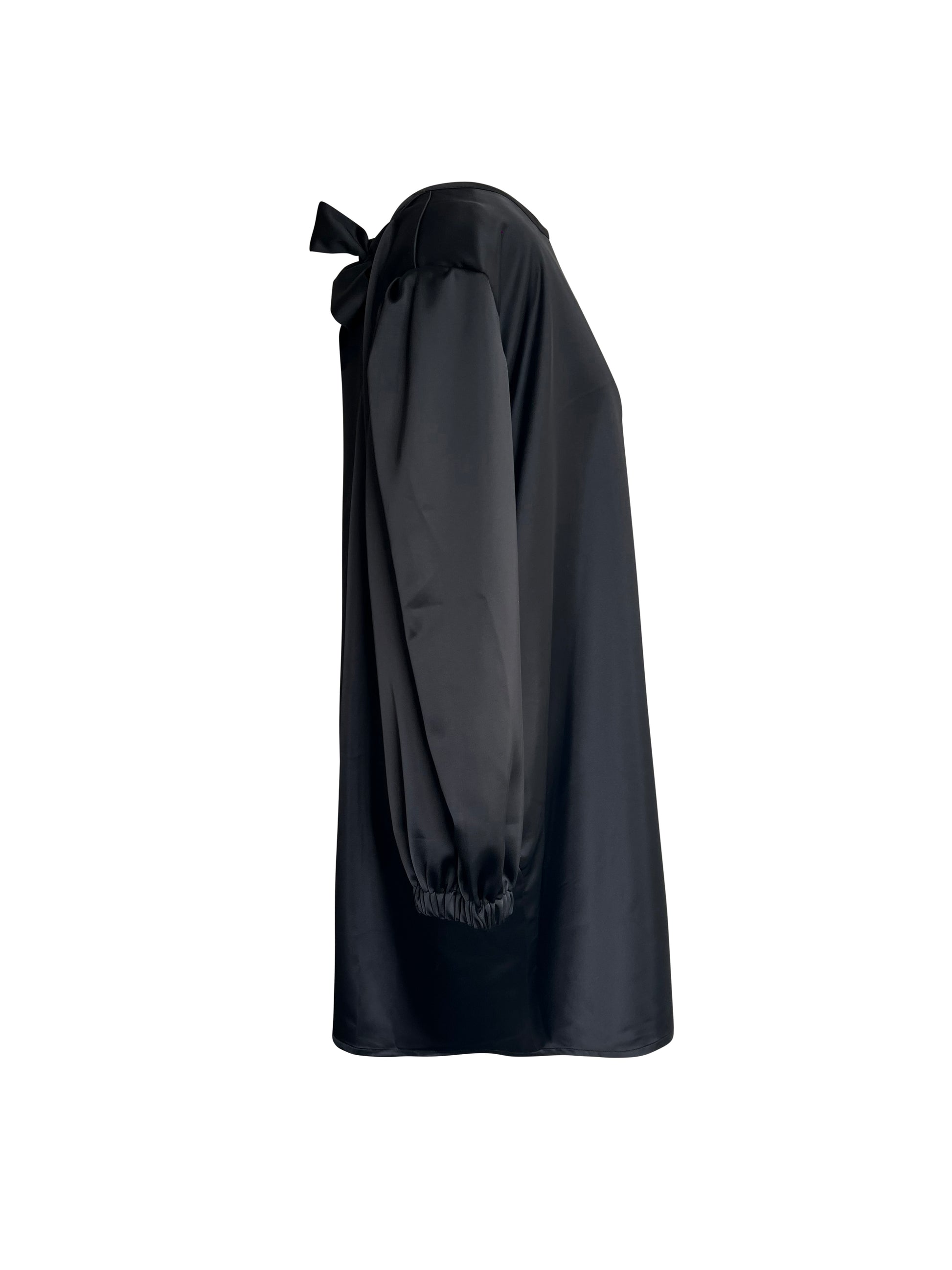 The back features a delicate bow detail with flowing ties and a tasteful keyhole opening, adding an unexpected touch of romance. Finished with long balloon sleeves and elasticated cuffs, this dress balances sophistication and comfort—perfect for evening events, parties, or elevated daywear.