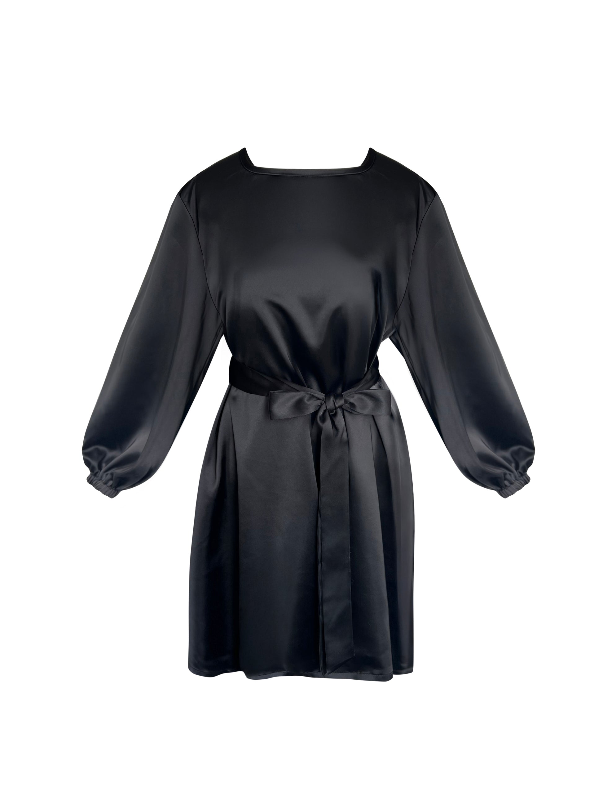 Turn heads from every angle in this timeless black silk satin mini dress. Designed with a sleek, minimalist front and a statement open back, this piece blends elegance with subtle drama. The softly draped silhouette is cinched at the waist with a matching satin belt, creating a flattering, feminine shape.