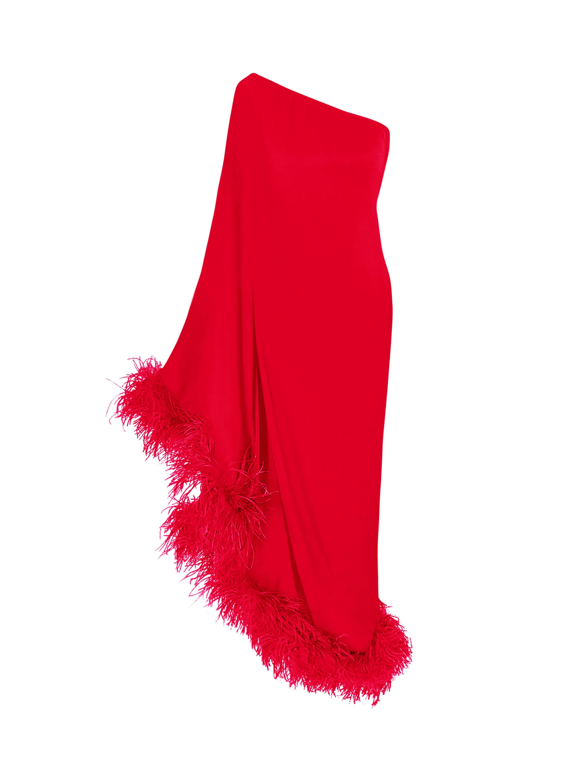 The Star Dress by Toma is made from 100% Cotton. Comfortable, yet stylish, this dress features a one-shoulder neckline that is stretchy and can also be adapted to your body. Featured in red, this dress has ostrich feather detailing that is sophisticated and elegant.