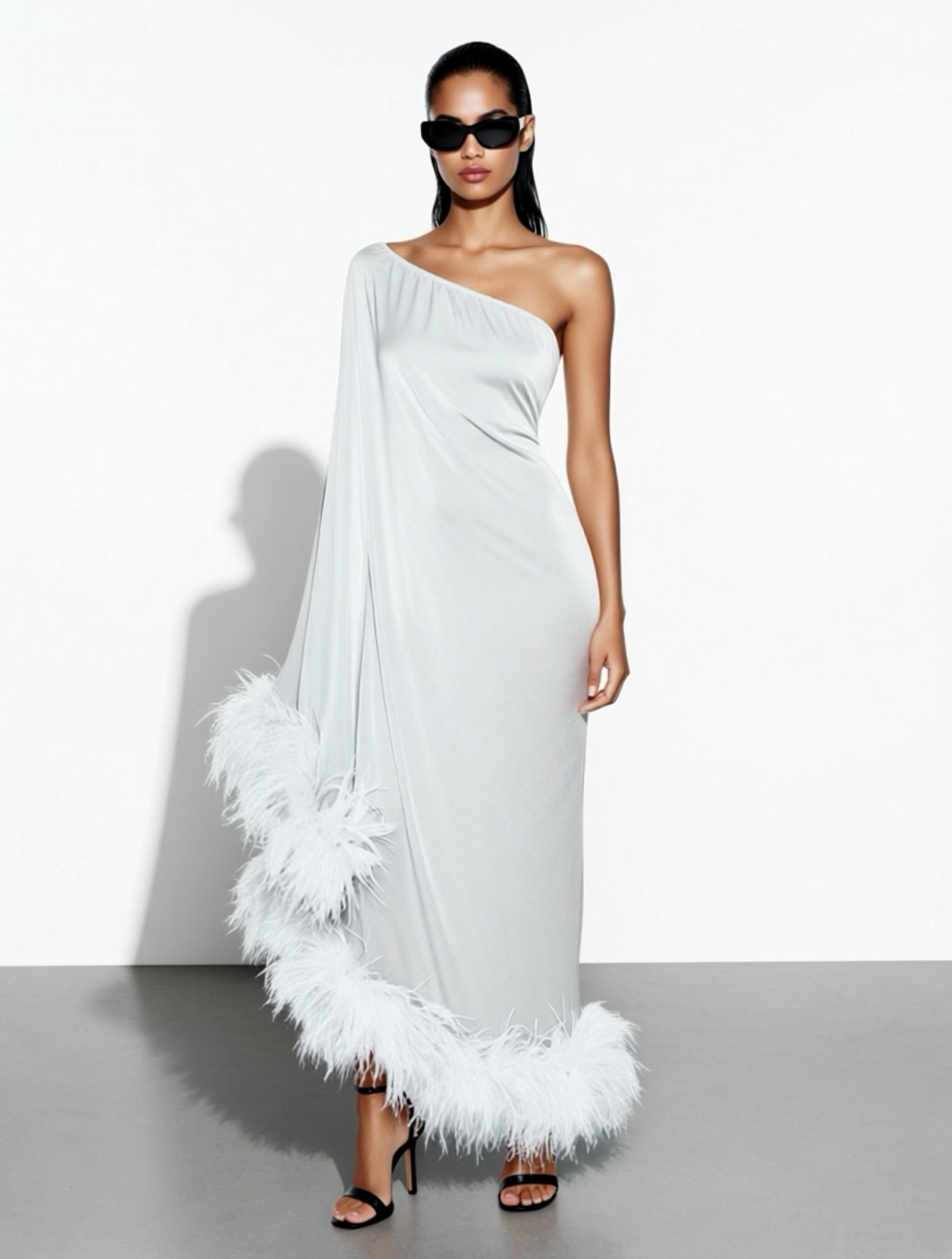 Crafted from bridal white silk satin, the fabric offers a soft, fluid feel with a subtle sheen, enhancing the dress’s sophisticated appeal. Delicate ostrich feather detailing adds a touch of glamour and texture, while the asymmetric hem creates modern movement and visual interest. Designed as a midi-length style, this dress is perfect for making an impact without sacrificing comfort.