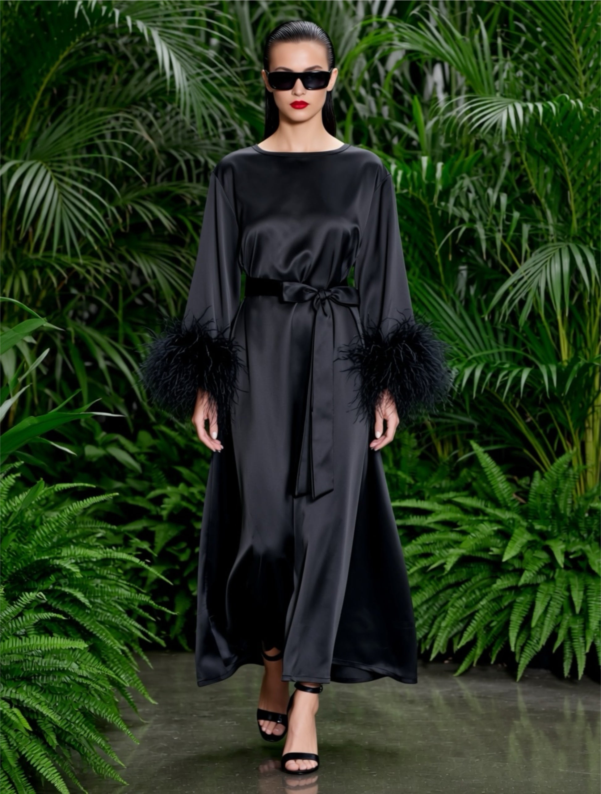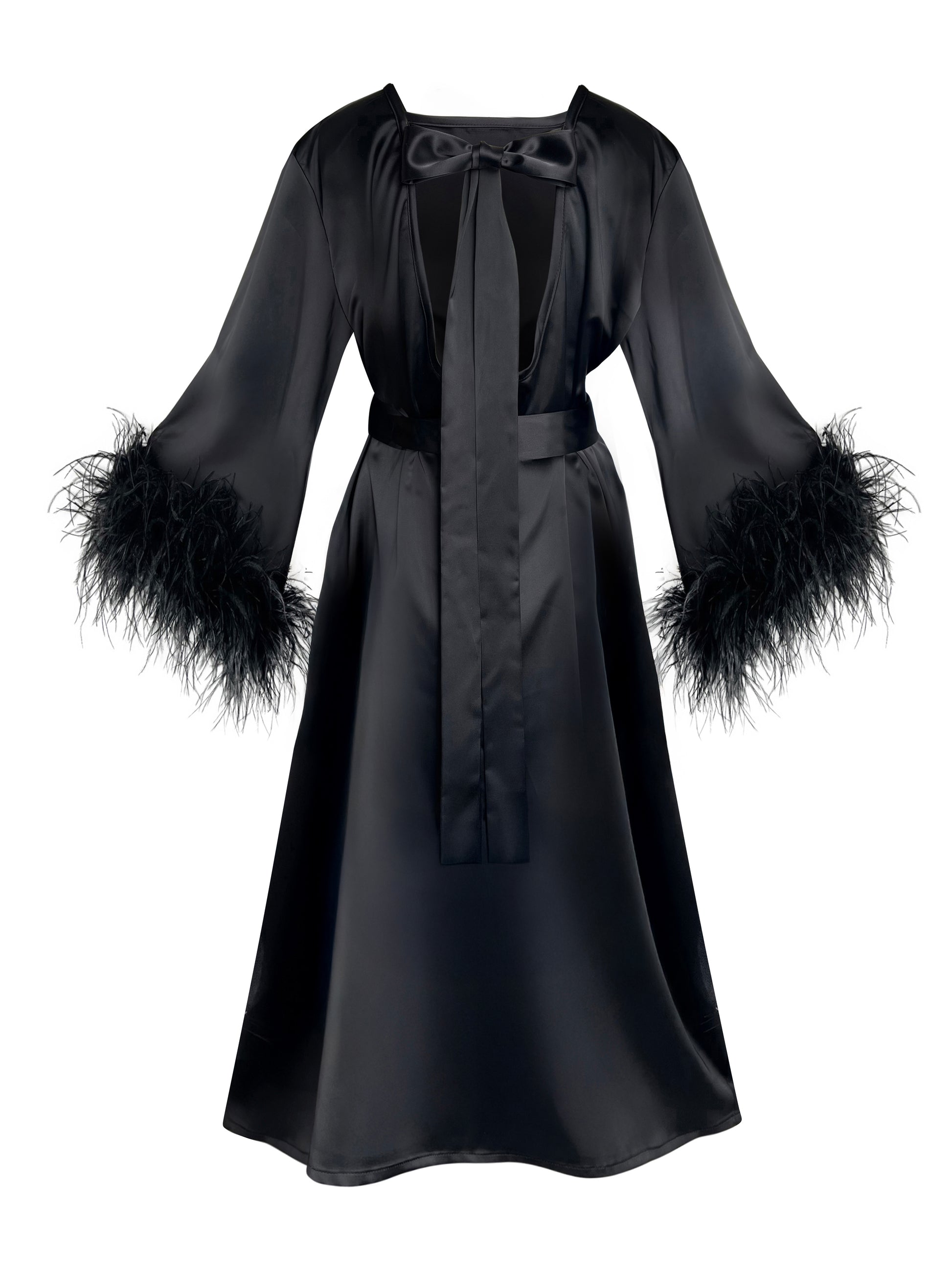 The highlight of the design lies in the feathered sleeve cuffs, bringing a touch of old-Hollywood glamour and boudoir sophistication. Long, flowy sleeves contrast beautifully with the mini length, creating a balanced and confident silhouette.