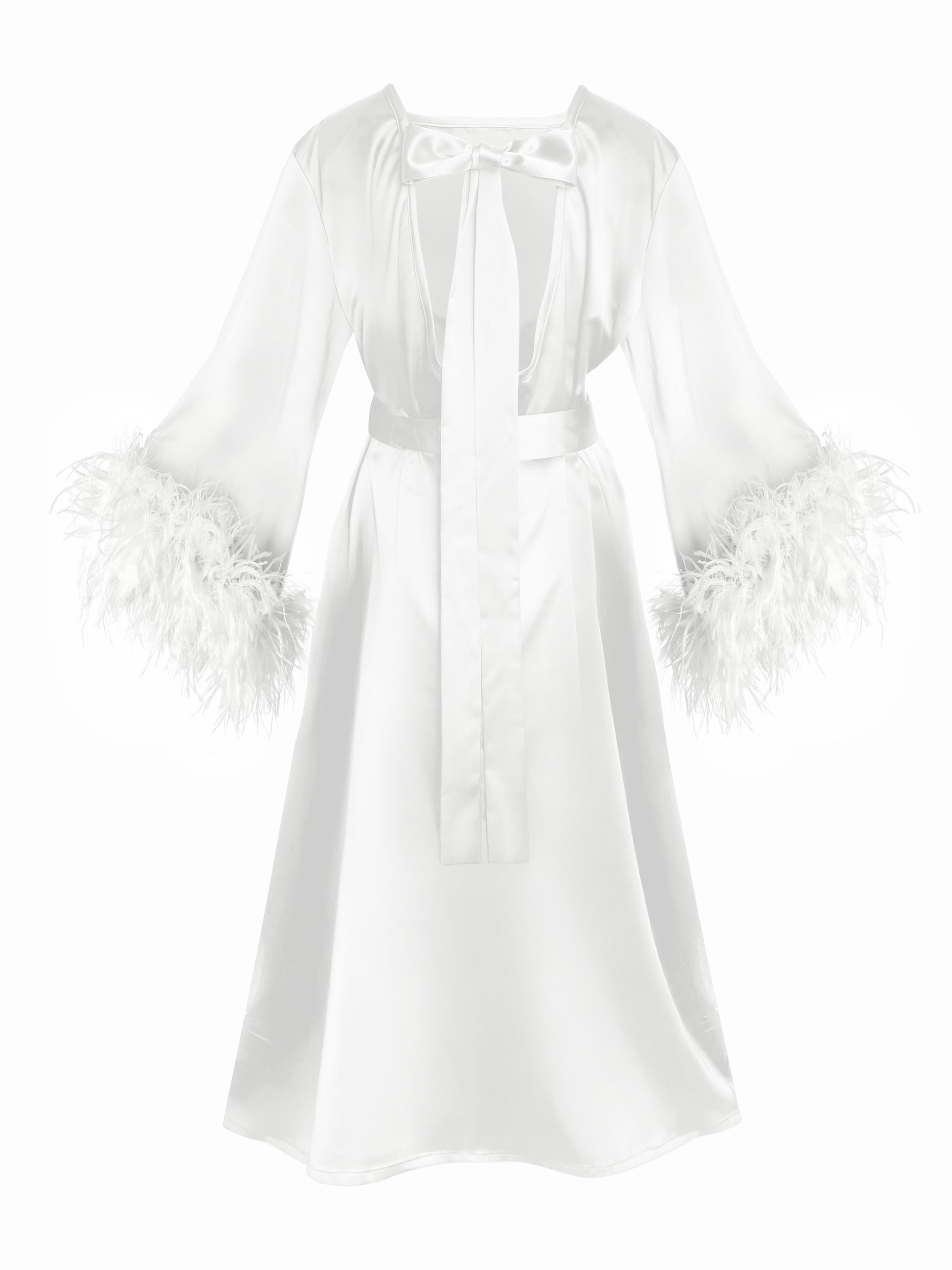 The dress features a deep V back neckline, finished with a delicate bow tie detail that adds refinement without revealing too much. A removable belt allows you to cinch the waist for a flattering silhouette or wear it loose for a relaxed, robe-inspired look.
