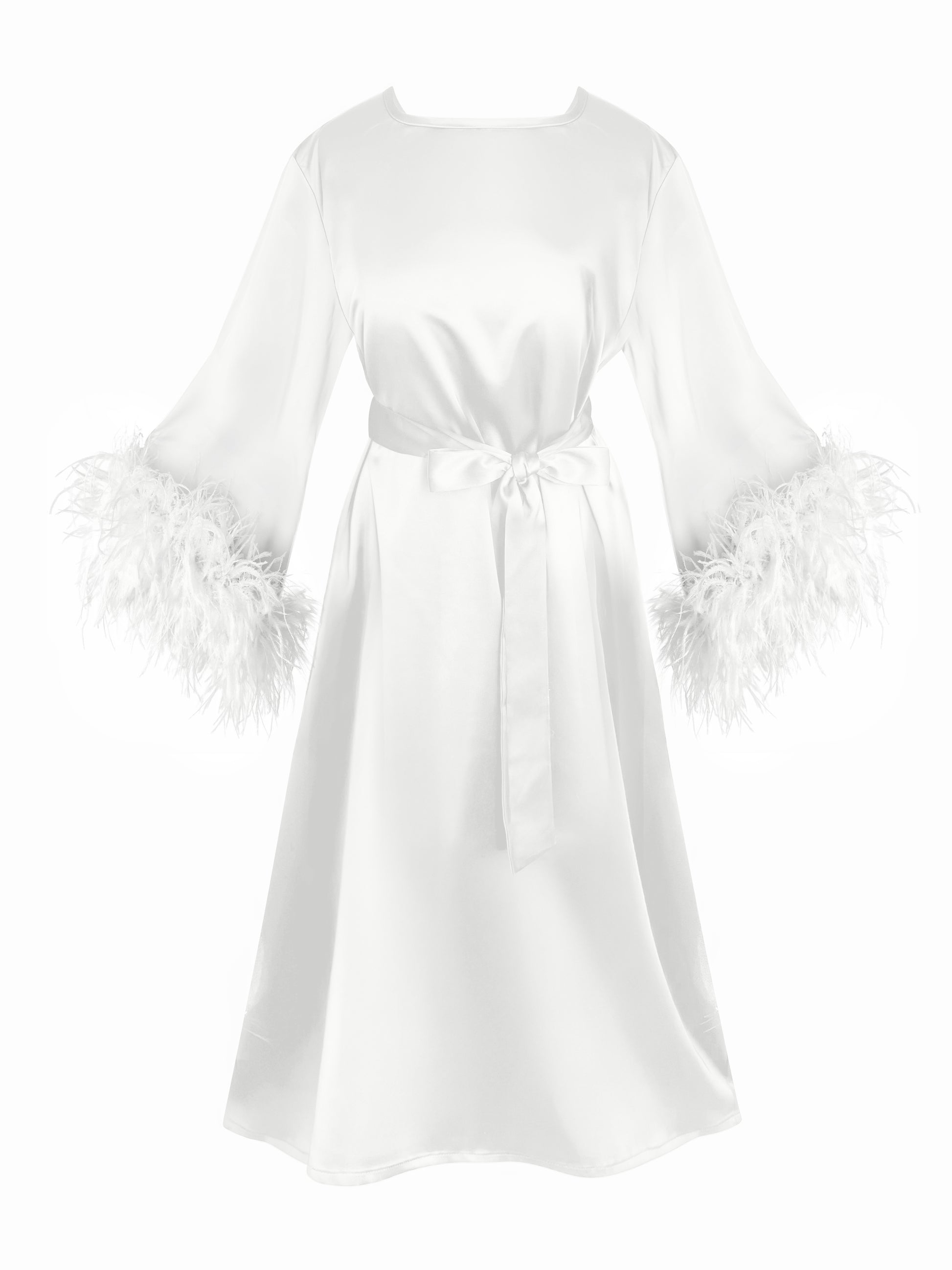 The highlight of the design lies in the feathered sleeve cuffs, bringing a touch of old-Hollywood glamour and boudoir sophistication. Long, flowy sleeves contrast beautifully with the mini length, creating a balanced and confident silhouette.